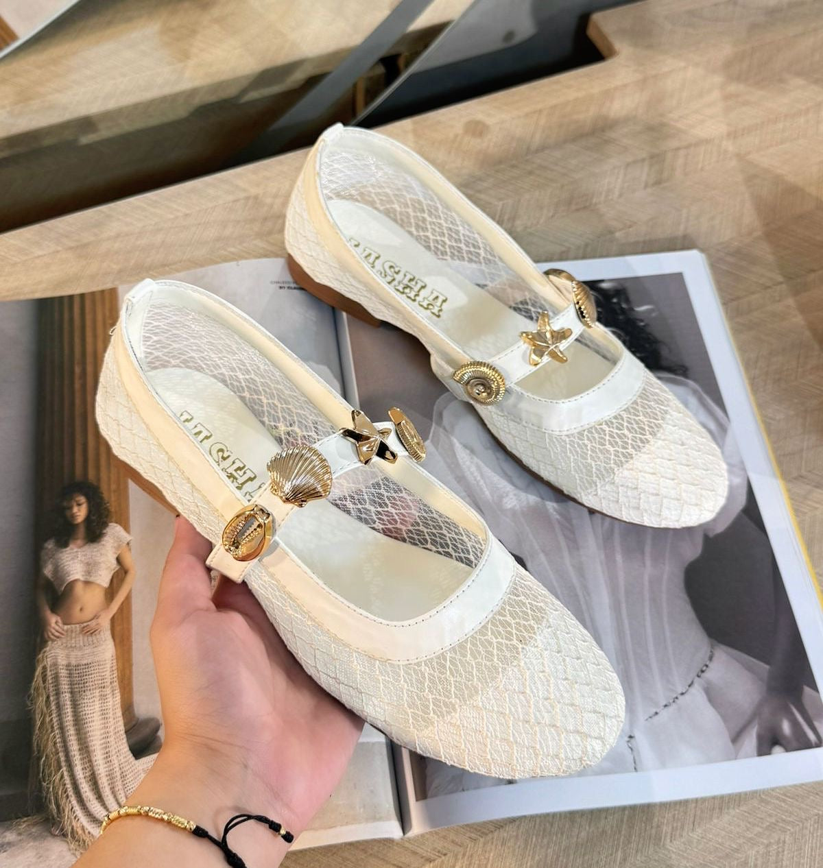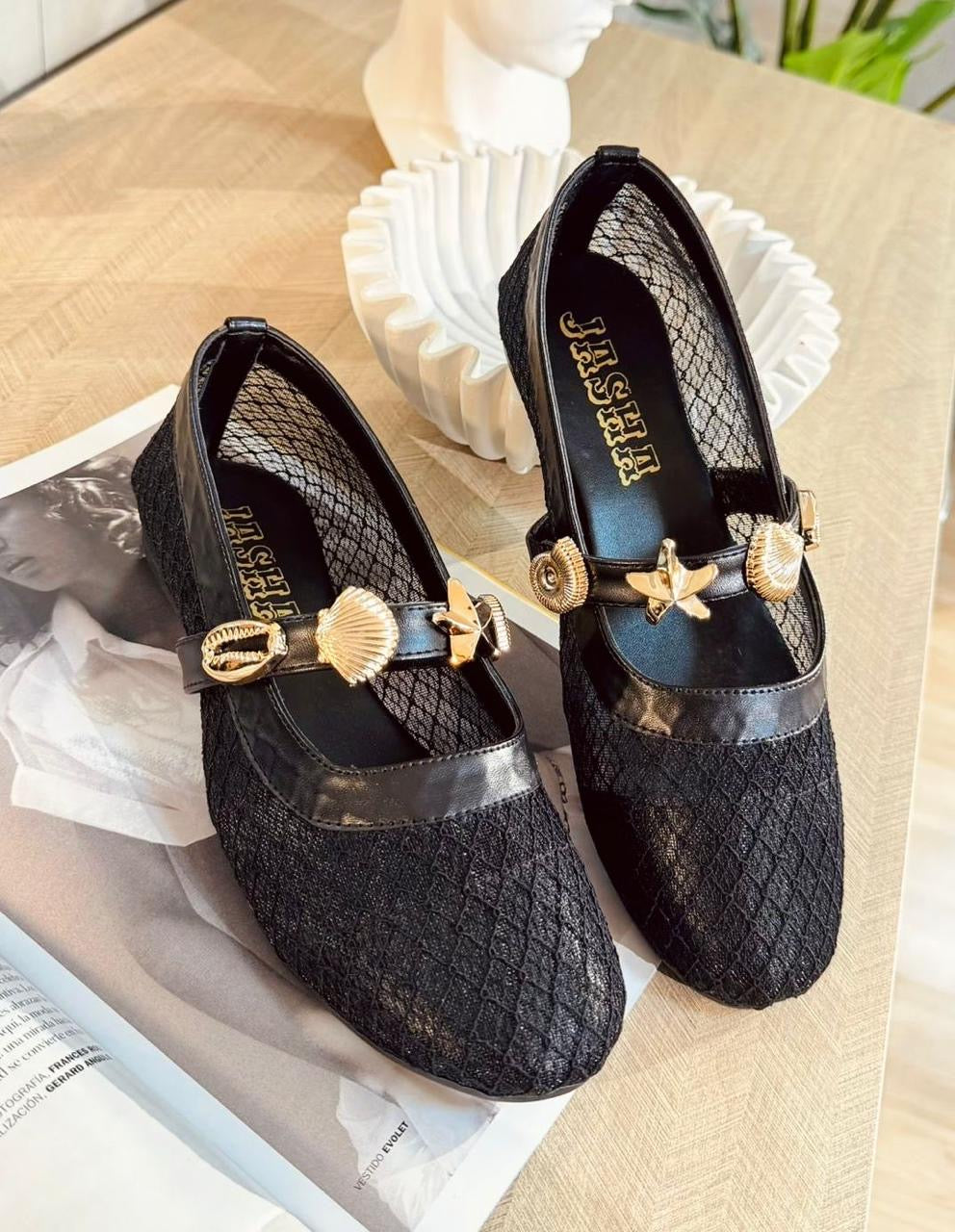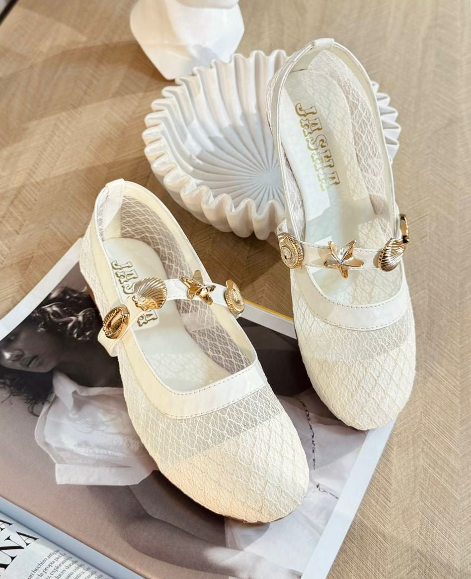 Diseñadas para la mujer moderna que valora tanto la comodidad como el diseño, estas baletas destacan por su textura de red delicada que permite una transpirabilidad total, manteniendo tus pies frescos y estilizados durante todo el día. El toque final lo dan sus exquisitos dijes dorados en forma de estrellas de mar y caracoles, cuidadosamente posicionados sobre la correa para añadir un brillo sofisticado a cada uno de tus pasos. ✨⭐