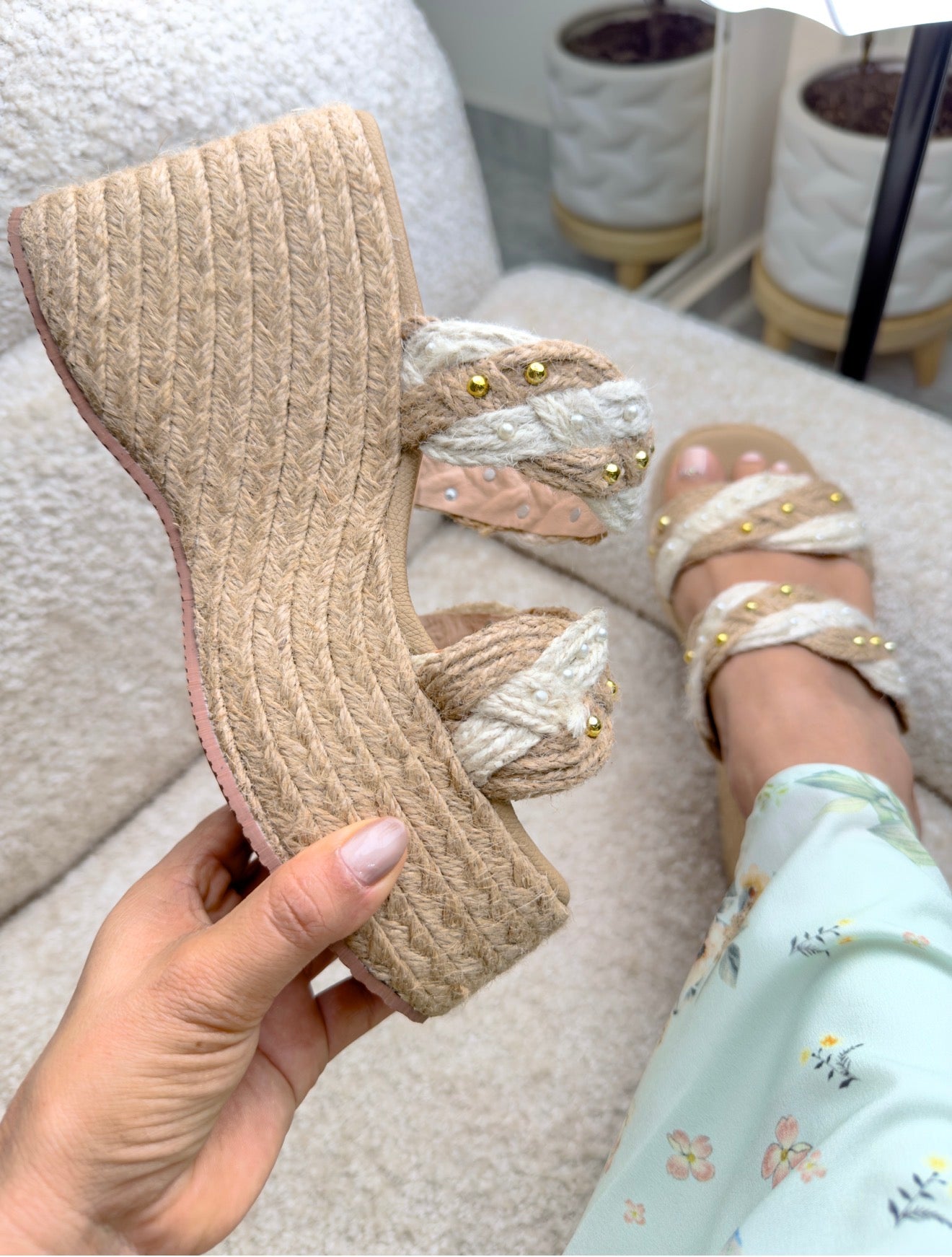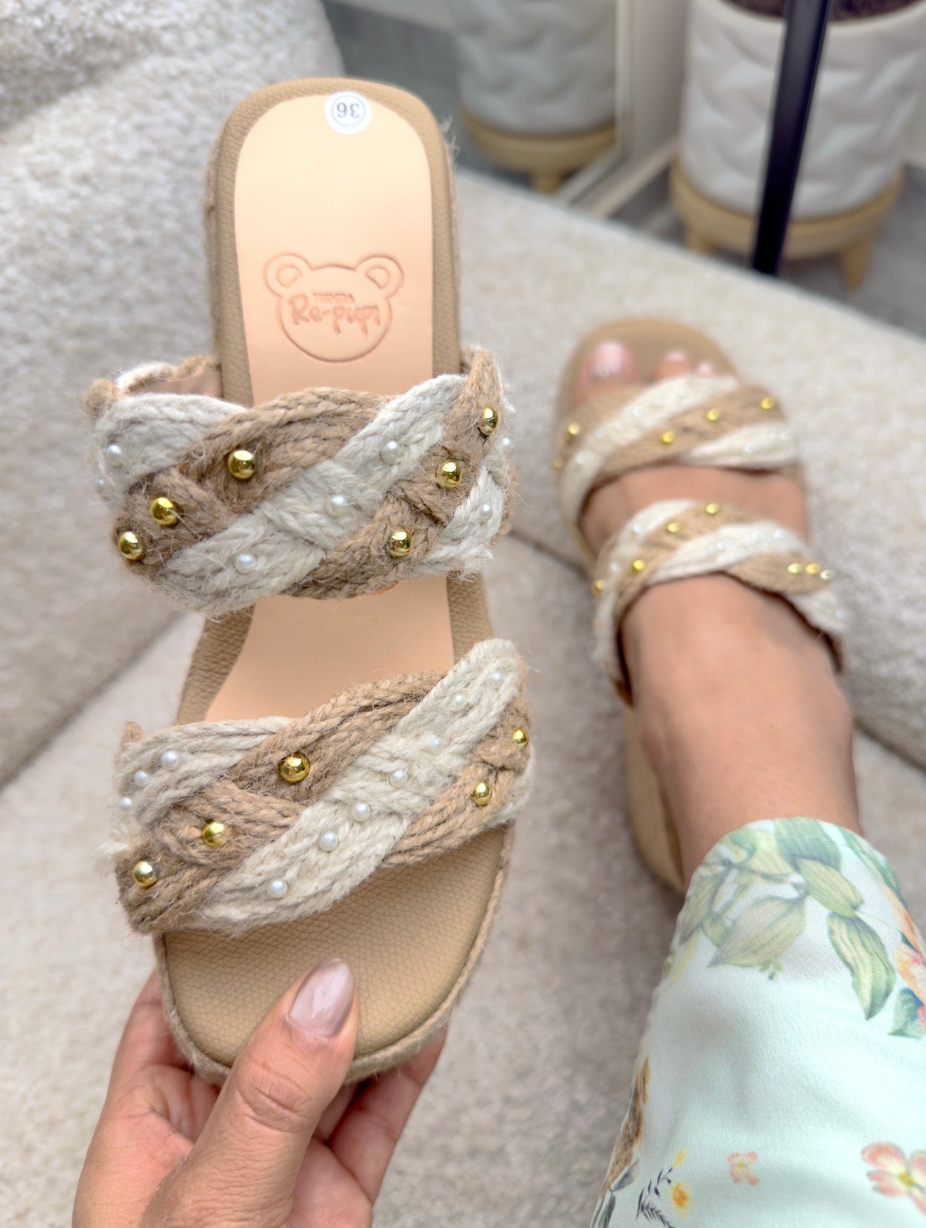 La capellada cruzada mezcla yute claro y oscuro, decorada con pequeñas perlas y taches dorados, creando un contraste delicado que eleva cualquier outfit. Su estructura firme garantiza una pisada estable y segura, mientras su diseño abierto mantiene el pie fresco y cómodo.