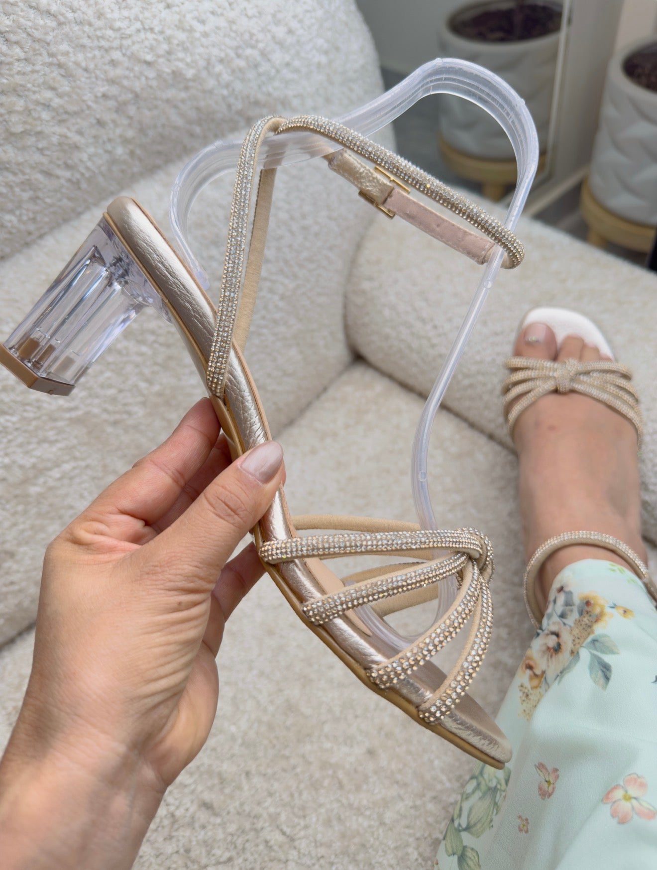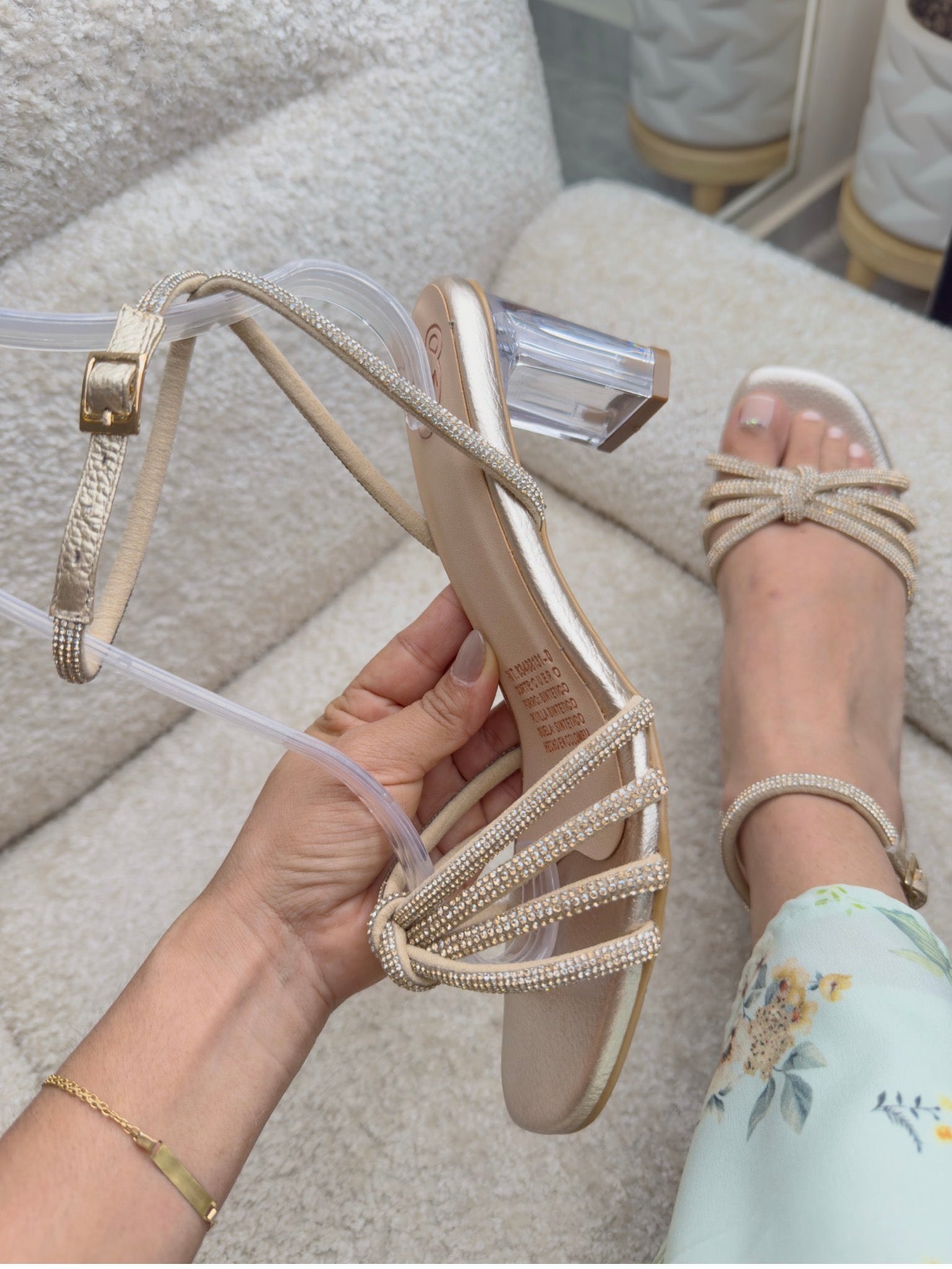 Deslumbra en cada paso con este tacón diseñado para robar todas las miradas. Sus tirillas de microcristales sobre el empeine, dispuestas en un nudo decorativo fijo, aportan un toque sofisticado y lleno de brillo que realza la belleza del pie.